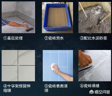 工序:基层处理→瓷砖泡水→弹线预排砖→水泥砂浆搅拌/瓷砖粘合剂(水泥砂浆配比详见图表)→铺贴瓷砖→瓷砖十字架卡扣预留伸缩缝→擦拭瓷砖表面残留砂浆→填缝
