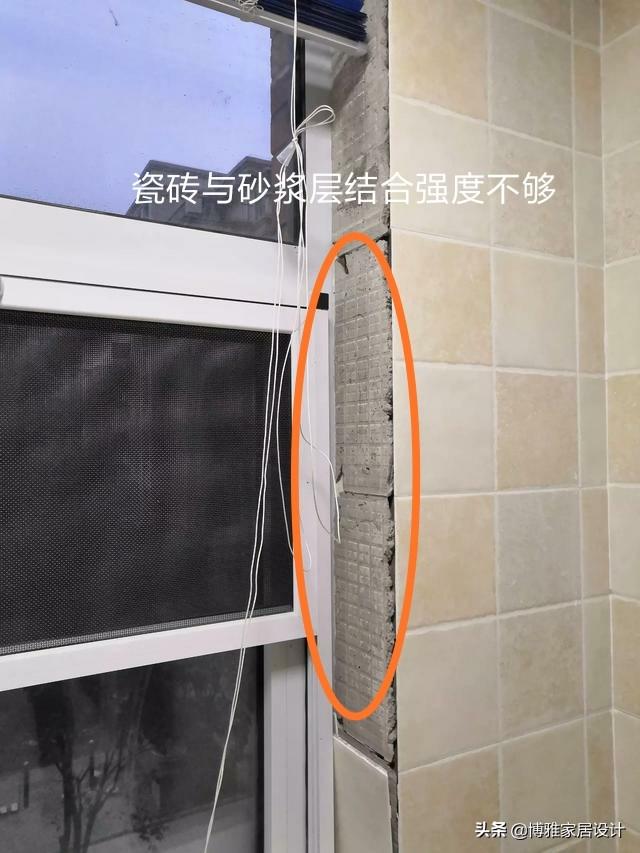 题主的图片显然就是瓷片与砂浆层脱开。先检查一下其他位置有无空鼓现象。从颜色来看,似乎水泥砂浆配比有些问题,水泥用量少而砂子用量多。还有可能是瓷砖没有泡水直接铺贴。无论哪种原因,可能都是这个卫生间普遍存在的问题。当然,最好的结果是,窗户一圈瓷砖铺贴时干燥过快导致,只需要重贴窗户一圈瓷砖就可以了。但是,极有可能整个卫生间都有问题。