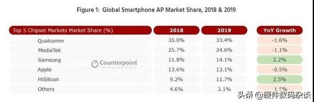 根据上图,我们看到高通骁龙处理器占据全球35%左右份额,而苹果手机采用自家专用A仿生处理器,份额为13%左右,也就是说除了高通和苹果处理器外的其他处理器占据50%市场份额。