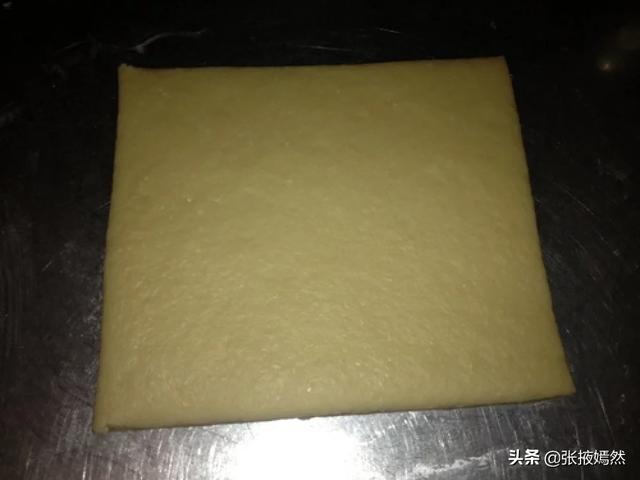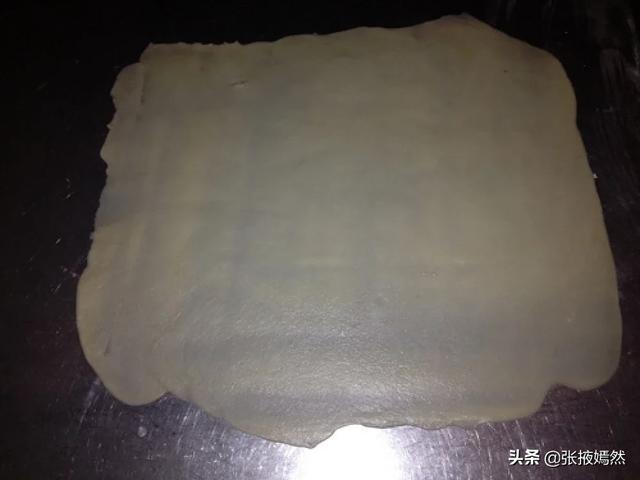 3.再做面皮,面粉加水色拉油搅匀,揉成面团,包保鲜膜醒发10分钟,在面板上撒一层干面粉,把面坯擀成0.6厘米的大片,把面皮擀成和面坯一样大小的面团待用。
