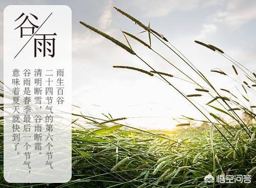 - 《月令七十二候集解》载:“三月中,自雨水后,土膏脉动,今又雨其谷于水也……盖谷以此时播种。”这里从雨水开始的“雨”到谷雨的“雨”,同是一字却有了很大的变化,雨水是由寒冷的冬天转暖后的初春雨,气温低,水雾细绵绵,随春风飘落,有雨落地后过夜即冻成冰。从雨水到谷雨历时两个月,已是晚春,气温渐高,并已稳定下来,很少再出现忽冷忽热的现象了。俗话说“谷雨种大田”。这时节,阳光充足,空气湿润,雨量充沛,极适宜农作物的播种及生长,这时的雨是“雨生百谷”的意思。不过这谷雨的谷字可不是仅指水稻这一种庄稼,而是春播粮食作物的统称。