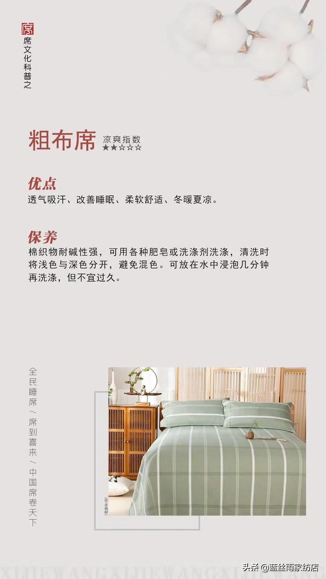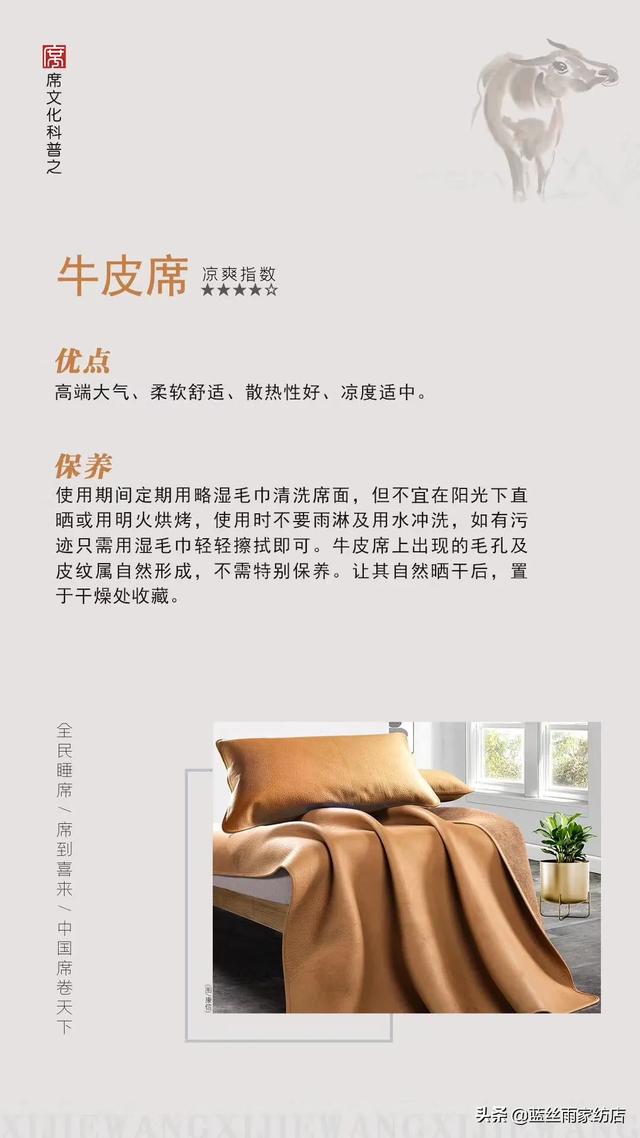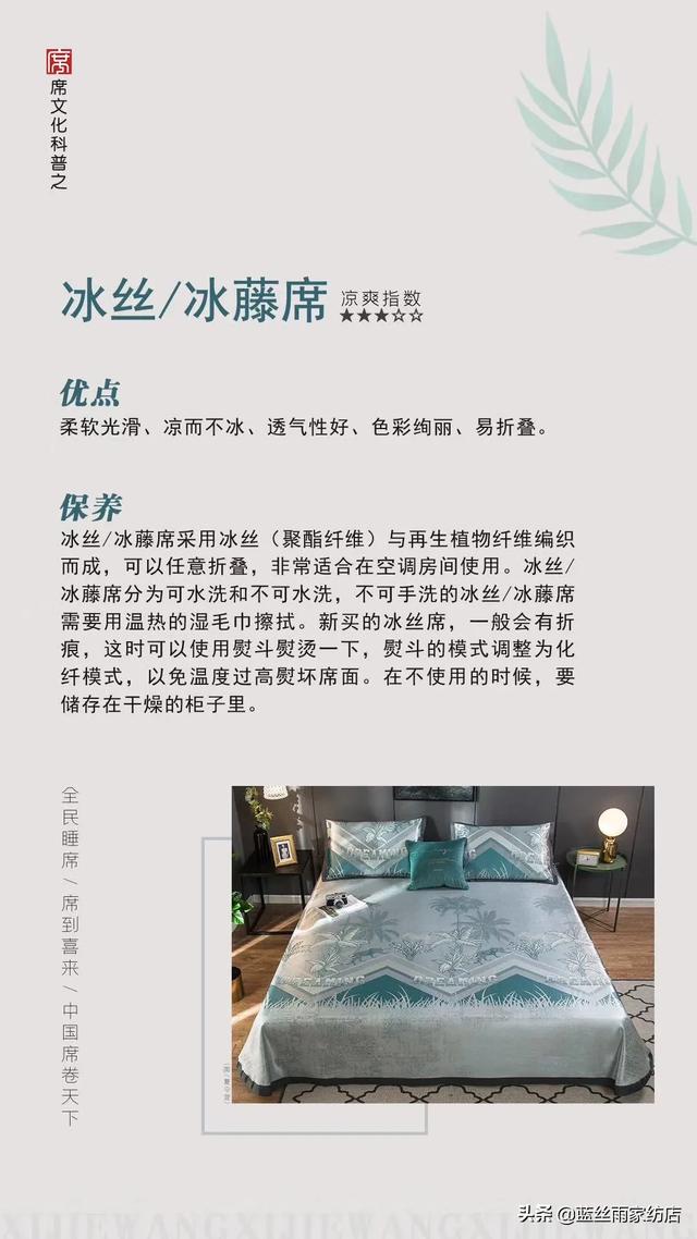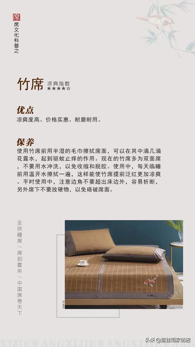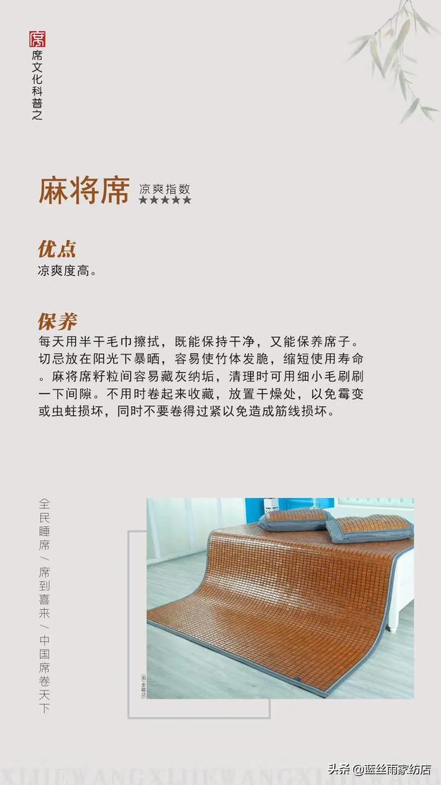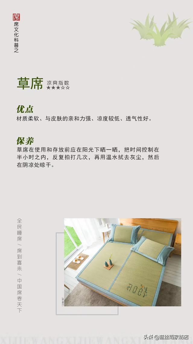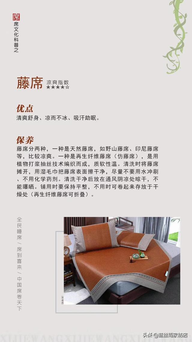 首先凉席分为:竹席(竹藤、竹冰丝)、麻将席、藤席(双面藤,藤冰丝)冰丝席、竹语天丝软凉席、棉麻粗布凉席、天丝软凉席、乳胶凉席、牛皮席等,以上也是大家最常用到的凉席种类……针对不同的席子不同的保养与清洗方法