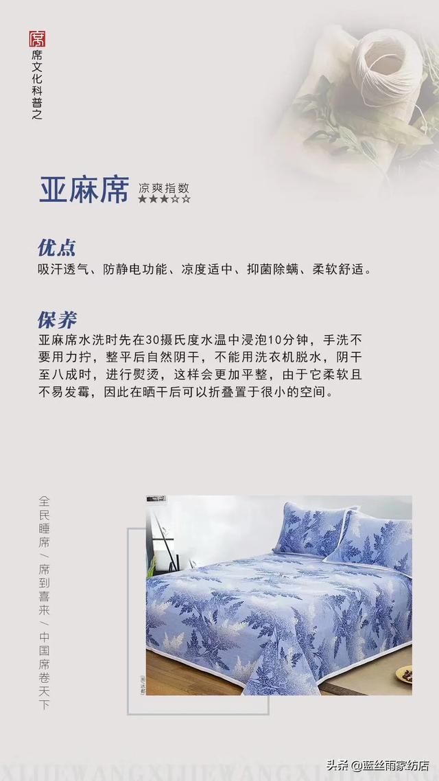 3、亚麻席具有吸汗,透气,抑菌等特点,被誉为“天然植物空调”,非常适合老人和儿童使用。