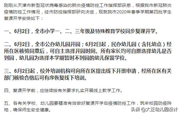 6月2日,天津市全市公办幼儿园开园,6月2日起,民办幼儿园(含托幼点)经所在区核验后,可自主选择开园时间。