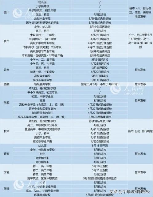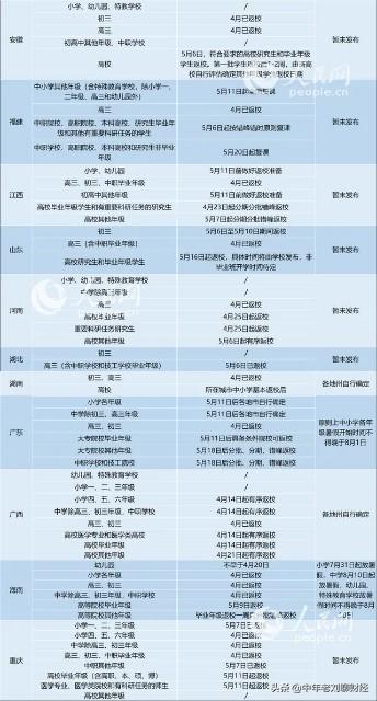 老刘带大家一起看一下各省区市各级各类学校返校时间表: