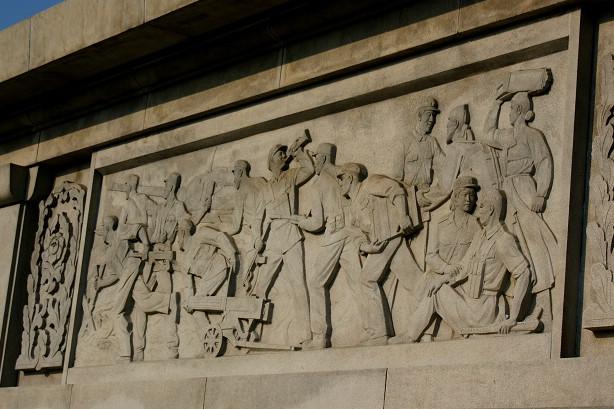 塔基座上刻有描述志愿军战士英勇战斗的石刻浮雕。