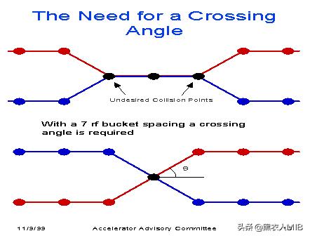 忽略文字,对照图一,你可以想象蓝色的束流从左向右,红色的束流从右向左,重合部分中间的黑点就是反应点,这样束流在对撞后就各回各家各找各妈,是不是很机智?但是这个方案有个小缺点,就是上图所示的「Undesired Collision Points」—— 在真正的反应点前后,两个束流会产生额外的碰撞!因此,对撞机上的束流都会在反应点采用「交会角」设计:让两个束流以一定角度交会,避免不必要的碰撞。这个方案就是上面图二的设计,就是交会角。