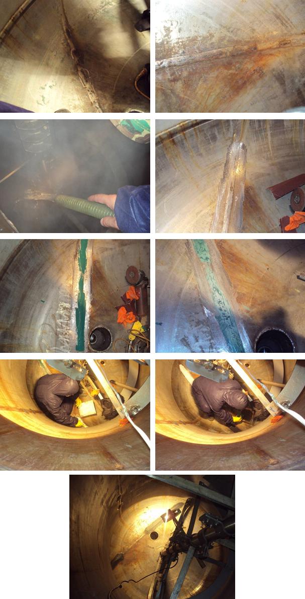 下面的案例是粗结晶罐罐体焊缝渗漏修补,用的是福世蓝2211F金属修复材料、2011、2012金属修复及耐强化学腐蚀高分子复合修复材料。