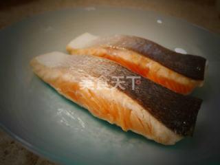 4取出三文鱼,备用。煎制不易太久,两边熟中间生最好