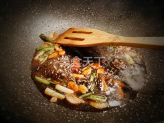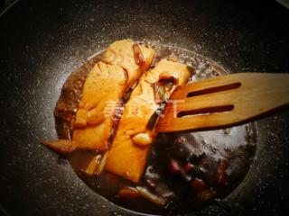 7酱汁调好后,放入煎制过的三文鱼。边煮,边用铲子把汤汁往向上的那一面鱼肉上浇,约5分钟