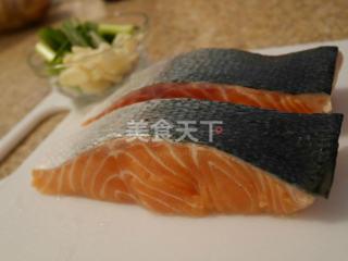 1葱切段,蒜瓣切片,姜切小片。三文鱼洗净用厨房用纸吸取多余水份。在三文鱼正反面撒上少许盐腌制15分钟