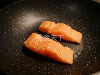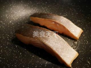 2煎锅滴入少许油,放入三文鱼,皮面朝下中大火煎制约2分钟。