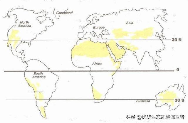 首先来看一下沙漠的形成。地球上沙漠的面积,可以达到陆地总面积的三分之一,这么大面积的沙漠,主要分布在大陆南北回归线附近,气温较高、蒸发旺盛、地表水奇缺是沙漠地区的普遍特点。