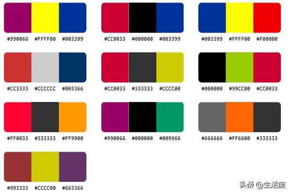这种搭配,彩色饱和度高,对比强烈。就比如,红+黑+蓝色