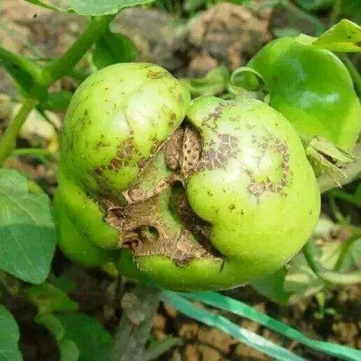 4、缺钙:番茄需钙量大,花期缺钙可发生顶裂果,幼果脐部及周围果皮开裂,胎座组织外翻,使幼果形成七翻八裂的畸形果。幼果膨大期缺钙,可形成脐腐果,俗称“黑膏药病”。