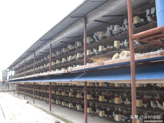 屋架常采用人字式,北檐高2.5米,南檐高2.8米左右;如用玻璃钢瓦或石棉瓦盖平顶式,应注意加固堵漏,以防龙卷风、台风和暴风的袭击。鸽舍的进深为2.2米,正中央需有1.5米宽的操作道,四周设有排水沟。鸽笼相向而立,可有3层或4层笼舍,笼舍以4层的铁笼为佳,且高度以1.6M为上限,方便人工作业。笼外由上到地面采用蓬布吊挂为好,冬天可放下篷布保暖,其他季节可卷起篷布达到通风透光的目的。