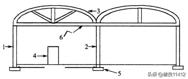 1.边立柱 2.中立柱 3.拱形吊梁 4.门 5.底座 6.横梁