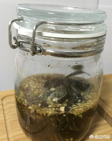 3、六月黄捞出,沥干水分后,放入一个可密封的罐子,倒入适量姜末,再把刚刚调好的花雕酒倒进去,酒量需要没过所有蟹。