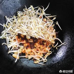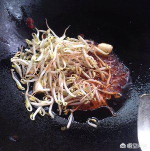 2.炒出豆瓣香时,放入豆芽,翻炒至豆芽八分熟时。