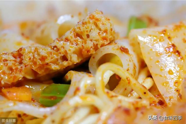 在炒米皮时,要不停地翻炒,不然糊锅不健康又不好吃了。