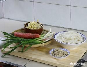 再将锅中放入少量的油,将葱、姜、蒜放入锅中,待炸微黄后,将米皮放入锅中,翻炒2~3分钟。