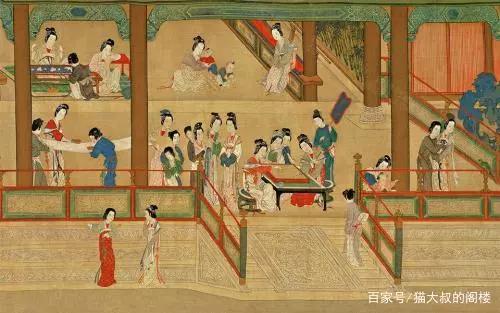 这幅图为明代仇英所作,主要描绘汉宫嫔妃的生活,仇英尤其擅长画人物,是明代最富有代表性的作家之一,与唐寅,文征明,沈周被后世并称为“明四家”。