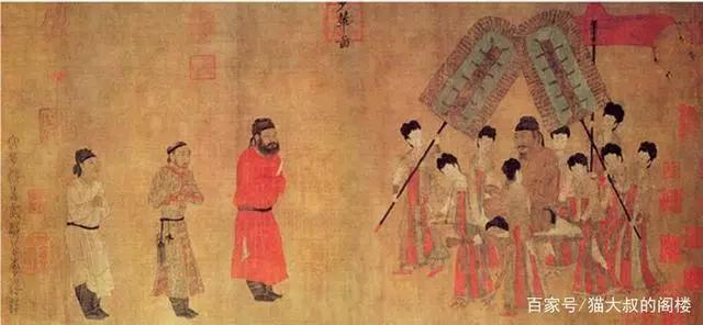 唐代阎立本的《步辇图》,为故宫博物院所收藏,描绘的是唐太宗接见来迎娶文成公主的吐蕃使臣禄东赞的故事。