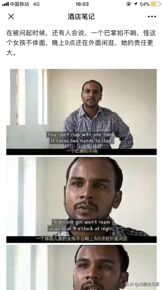 在被问起时候,还有人会说,一个巴掌拍不响,怪这个女孩不体面,晚上9点还在外面闲逛,她的责任更大。