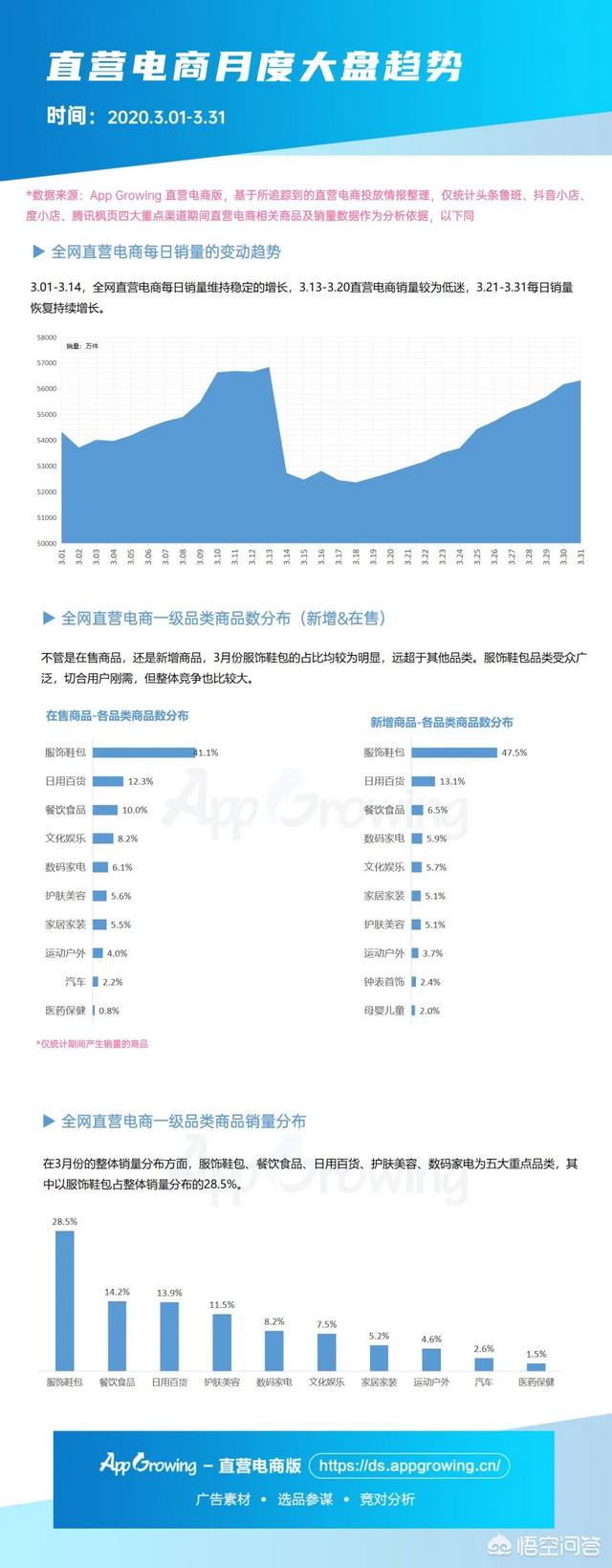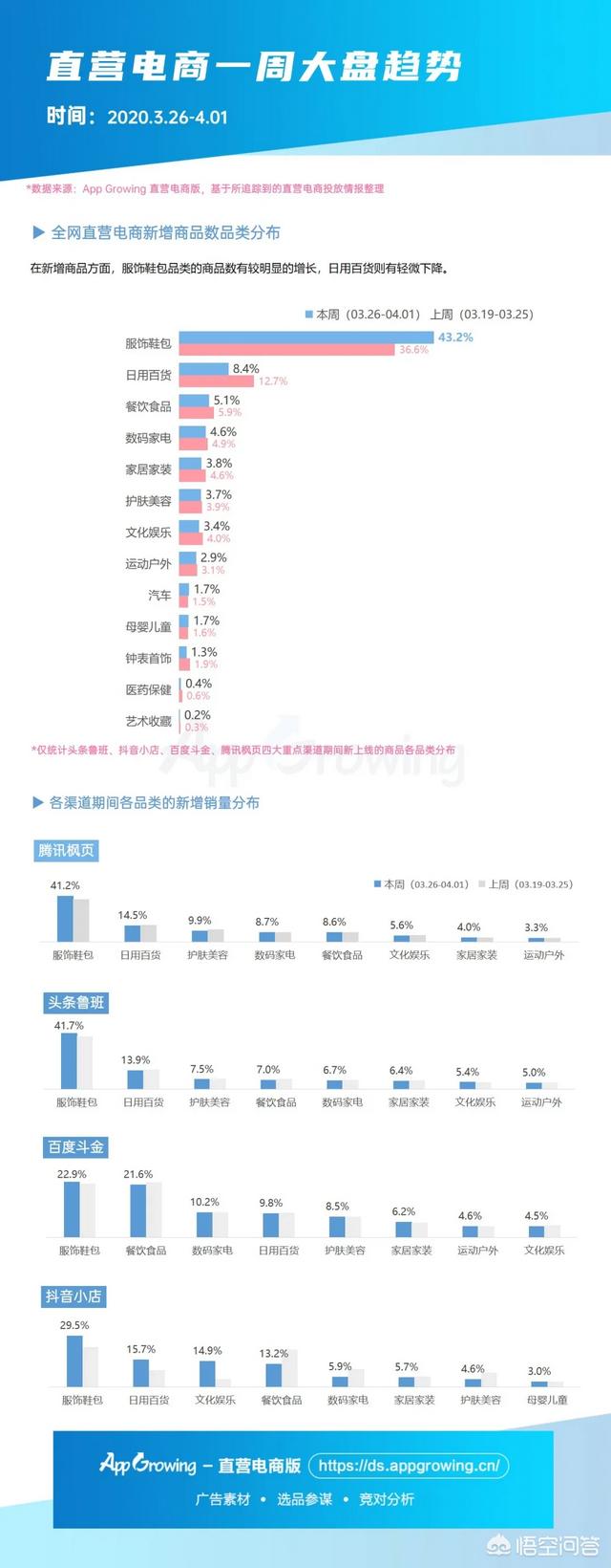 根据App Growing数据分析,本周(3月26日-4月1日)各渠道哪些品类热销,哪些商品潜力较大?来看看本周直营电商大盘趋势&商品情报吧。在刚刚过去的3月份,直营电商呈现哪些大盘趋势,哪些品类上新多,哪些单品热销?本文将分为两部分,一方面分析本周(3月26日-4月1日)直营电商的商品情报,另一方面也呈现对3月份直营电商整体大盘趋势洞察及解析。