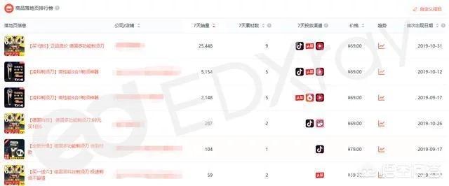 来到商联网数据平台这款商品的落地页排行榜,可以看到过去七天共有6家公司在销售这款商品。除了排在首位的这家公司之外,其他家公司的销量都十分惨淡。先根据图上的数据来分析一下排在榜首的公司销量为何如此之好。从落地页的信息来看,销量最高的这家公司广告语十分明确清晰,先是优惠的清晰,【买1送6】这样的优惠信息放在了广告语的开头,以阿拉伯数字表达出来的"1""6"更能抓住人们的注意力,其次"正品底价 德国多功能剃须刀"透露了产品的质量上乘价格美好的信息。从榜一公司的素材数来看,明显多于其他家。从投放渠道来看,排名前三的公司投放渠道相似并且多于排名后三的公司,在相同投放渠道的情况下,广告素材多的公司的销量明显比广告素材少的公司的销量好。以上原因就是榜一之所以能得到这么高销量的原因了,但是仅仅看这些是不全面的,还需要看一看商品的趋势和具体的广告素材。