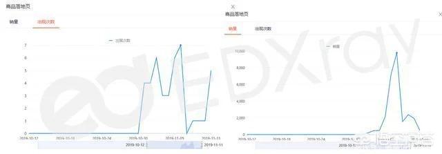 通过商联网的商品落地页趋势可以看到这家公司的出现次数趋势和销量趋势,根据图上的信息可以知道,这家公司在10月30日的时候就开始投放这款商品的落地页了,从销量趋势也能看出来在商品落地页刚开始投放的时候,商品销量并不好,但是随着落地页出现的次数增多,商品的销量也逐渐增多,随着落地页出现的次数减少商品销量也在降低。从商品落地页趋势来看,商品销量达到顶峰需要一个商品素材短期的投入。
