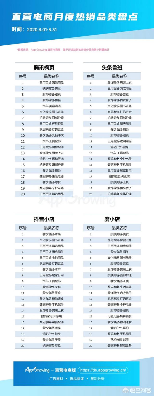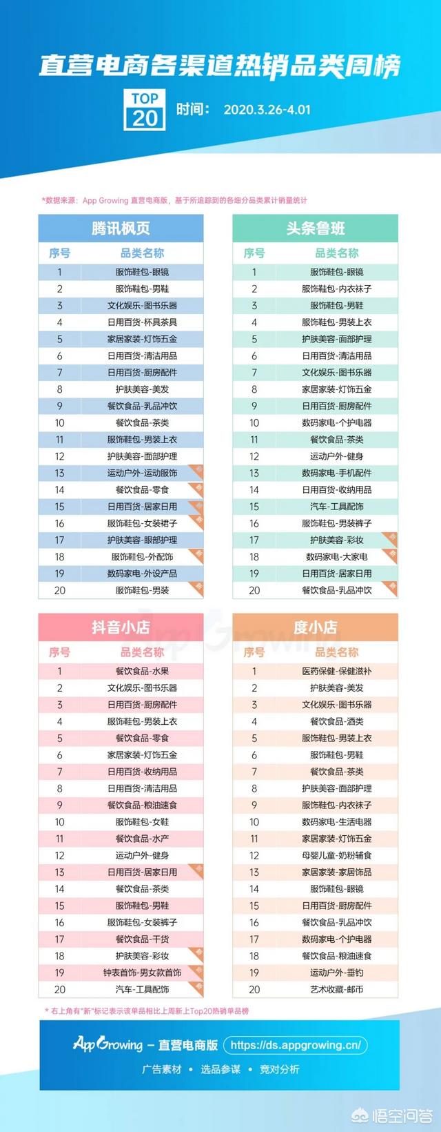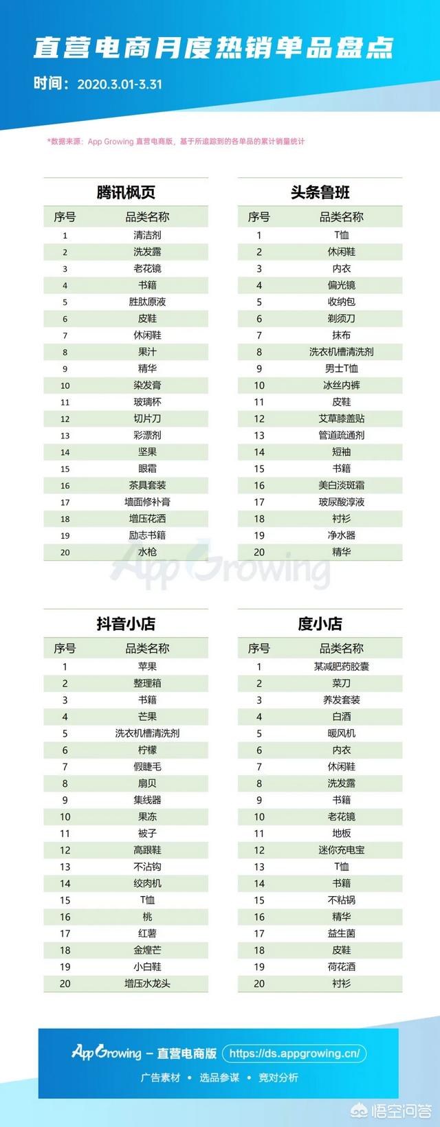 说明:以下热销商品推荐基于App Growing所追踪到的各渠道(腾讯枫页、头条鲁班、抖音小店、度小店)的商品销售数据并经进一步计算统计整理而成,以不同商品在所对应的平台在3月26日-4月1日期间新增的销量作为推荐依据。月度的数据则以1月1日-3月31日的相关数据为依据。