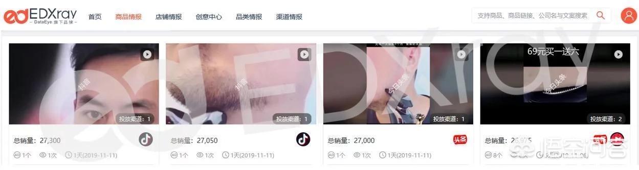 商联网广告素材页销量排行榜前四的广告素材都是这家公司的,根据这些信息可以看出这家公司的广告素材是以视频广告为主,视频广告内容是以使用这款刮胡刀为主,有的用来刮胡子,有的用来剃头,还有的用来修剪鼻毛,体现了这款刮胡刀的使用功能的多样性。通过右下角的小图标可以发现,销量最好的渠道是抖音平台,再看总销量数会发现今日头条和抖音的销量差距并不是很大。