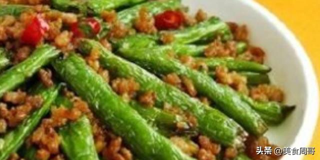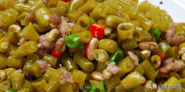 肉末豇豆,川味泡豇豆一把,如果是泡的时间长的,需用水漂去一部分盐味至咸淡适中,准备热锅冷油,下干辣椒节炸变色,下肉末炒干水气,加入沥干水分的泡豇豆翻炒,加适量味精,鸡精即成。