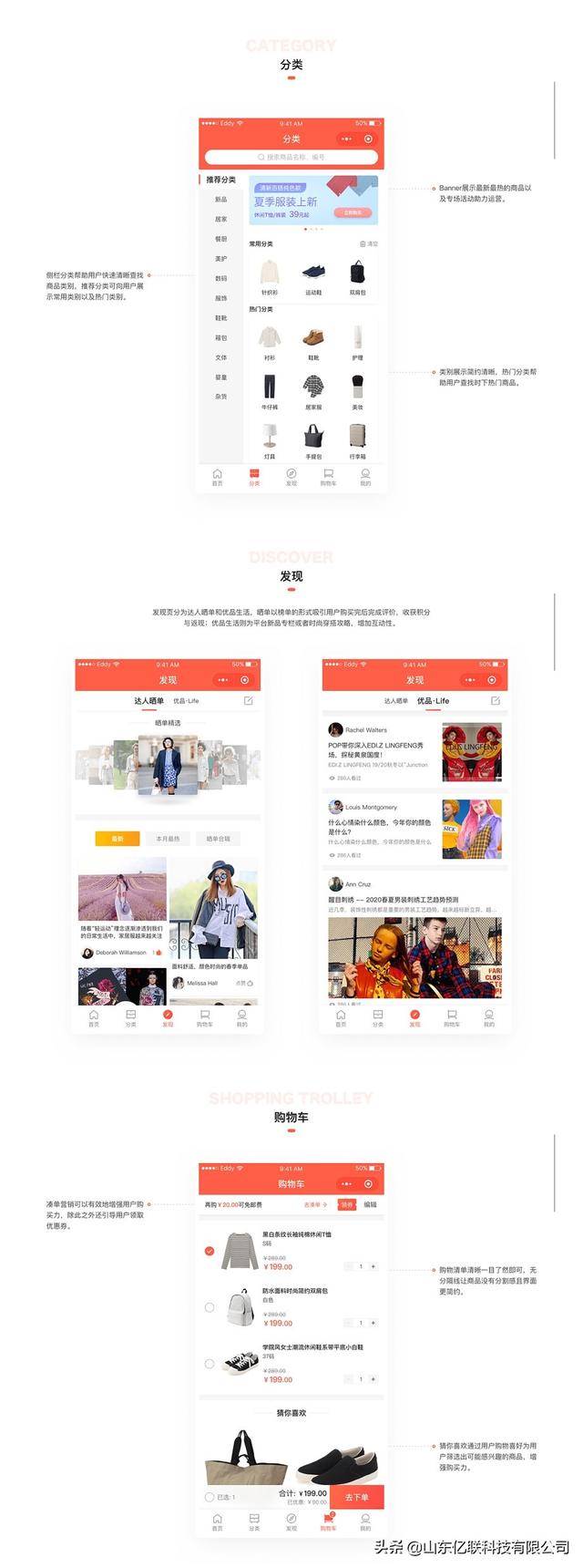 6、发现功能页面分为达人晒单和优品生活,晒单以榜单的形式吸引用户购买完后完成评价,收获积分与返现,优品生活则为平台新品专栏或者时尚穿搭攻略,增加互动性。