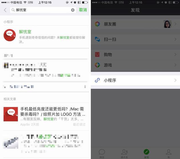 如果你还没有使用过任何小程序,现在在微信首页的搜索框搜索「解忧室」,点击解忧室的小程序,发现页面的入口就会显现出来。