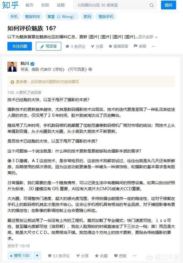更令人惊奇的是,这位跨界粉丝也是一名隐藏的煤油——在回答的最后他表示已经使用了还未上市的魅族16工程机,并且对这台工程样机的可以自行定义ISO、曝光度等项目的专业模式做出肯定,“大底大尺寸CCD想过相当不错”。另外,通过他的描述,魅族16的OIS光学防抖效果也非常稳定。这条回答瞬间引发大量讨论和点赞。