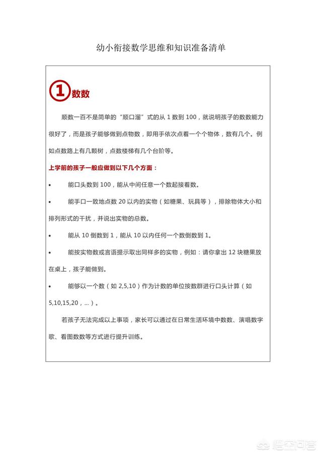当然知识准备也是有必要,这里不仅仅是课本知识,而且还有学科思维习惯的培养,附上数学知识和数学思维准备清单(共5点),家长朋友们可以下载打印版,打印出来对照练习。完整版下载请点击我的头像,在点击关注,私信回复“幼小清单”