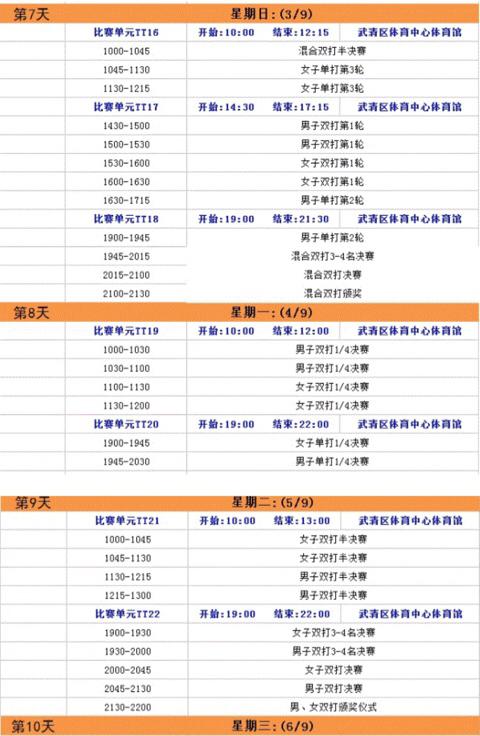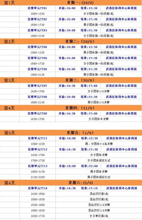 本届全运会乒乓球比赛的时间是8.28-9.6,比赛场馆在天津武清区体育中心体育馆。