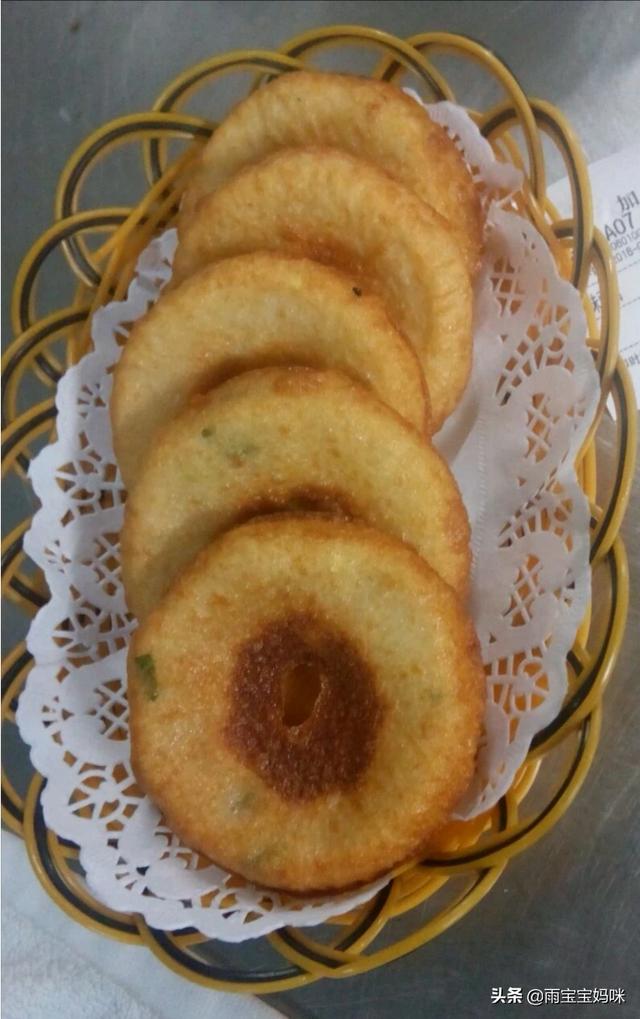 5.面窝。大米、黄豆混合磨成米浆,米浆倒入特制的勺子内,放到油锅里炸,很快就炸出一个边厚中空、色黄脆香的圆形面窝。吃起来厚处松软,薄处酥脆。