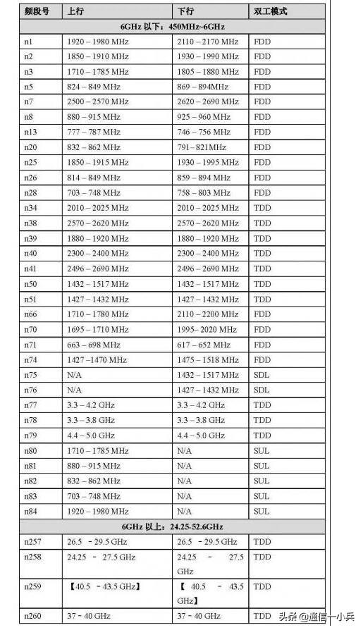 同样的,5G也划分了一些频段,其中部分频段是4G已经使用的,编号其实也没有改变。4G里的频段名叫BX,而5G里叫NX,也就这点儿区别。