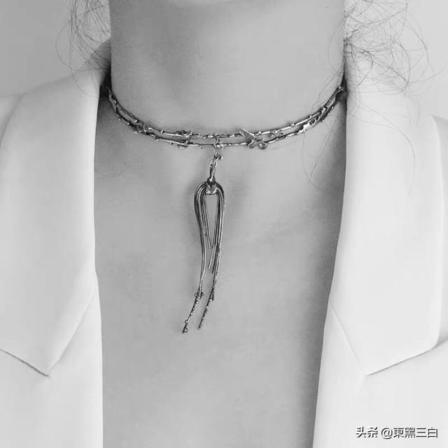 二、暗黑御姐风,黑色连衣裤搭配黑色高领毛衣,鞋子搭配高帮马丁鞋,或者绒面高跟鞋,如果全身是黑色的话,就要注意区分各种黑色面料的材质感,增添丰富的细节,最最主要的来一些相配的首饰,像下面这款项链就很不错,绝对可以让你又潮又有范!