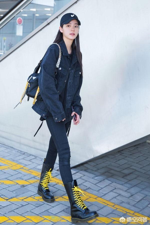 马丁靴+黑色紧身牛仔裤,最经典的搭配,也是最早期的搭配。黑色紧身裤非常显瘦拉长腿,再加上同色的马丁靴,有一种低调的霸气的时尚。