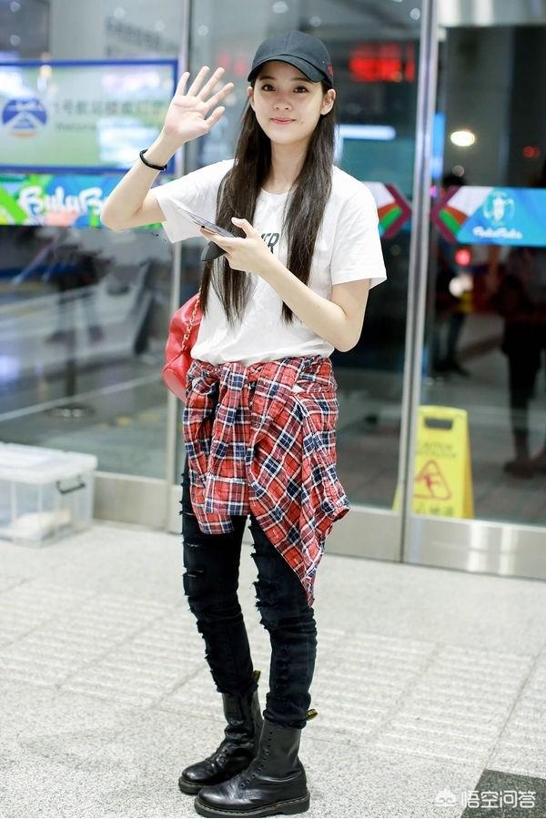 同样是马丁靴+黑色紧身牛仔裤,上身改为白色T恤,腰间绑上红色格子衬衫,又是不同的气质,有一种邻家小仙女的乖巧,帅气的甜美.