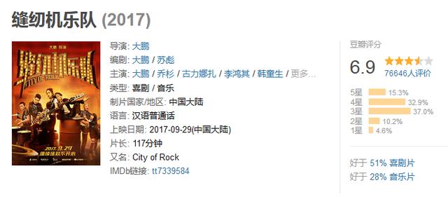 缝纫机乐队是大鹏导演的第二部电影。该电影讲述的是摇滚爱好者想要保住为儿时摇滚组合而建立的摇滚公园,组乐队证明摇滚不死的故事。影片在十月一的档期上映,但是十月一的档期竞争相当激烈,因为同期上映的有《羞羞的铁拳》《英伦对决》《追龙》等国内大片,为了避免同期上映的这些大片,《缝纫机乐队》还提前一天上映,让人不禁猜测,是不是有点心虚?果然,在上映一天之后,评分和票房就已经被《铁拳》碾压,后来发生的事没有峰回路转,这一次,大鹏真的要想想了。