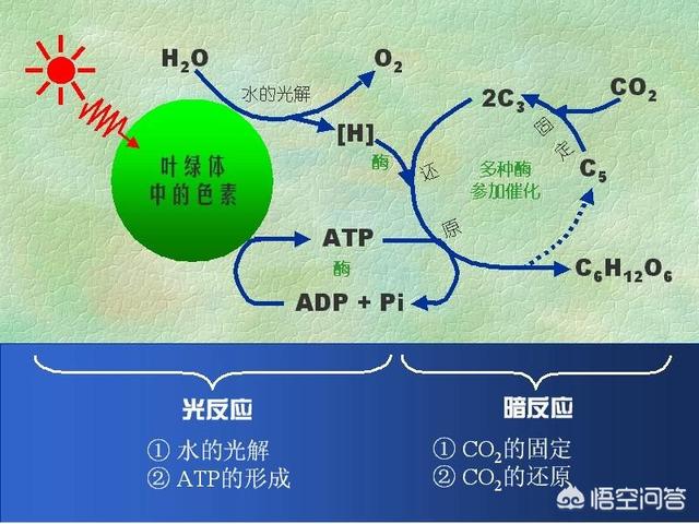 暗反应则需要二氧化碳、还原氢[H]、ATP和多种酶。