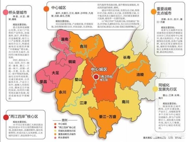 官方对此次规划的解释很多,不过对于群众来说大多很抽象,按照我自己的理解,重庆多山地,每个区都是以自己为中心带动周围发展,此次扩容感觉是想把主城九区作为一个核,周围12个区县作为12个卫星城分担不同功能,有点大东京的意思。不过具体怎么做,却没有说,有点摸着石头过河的意思。