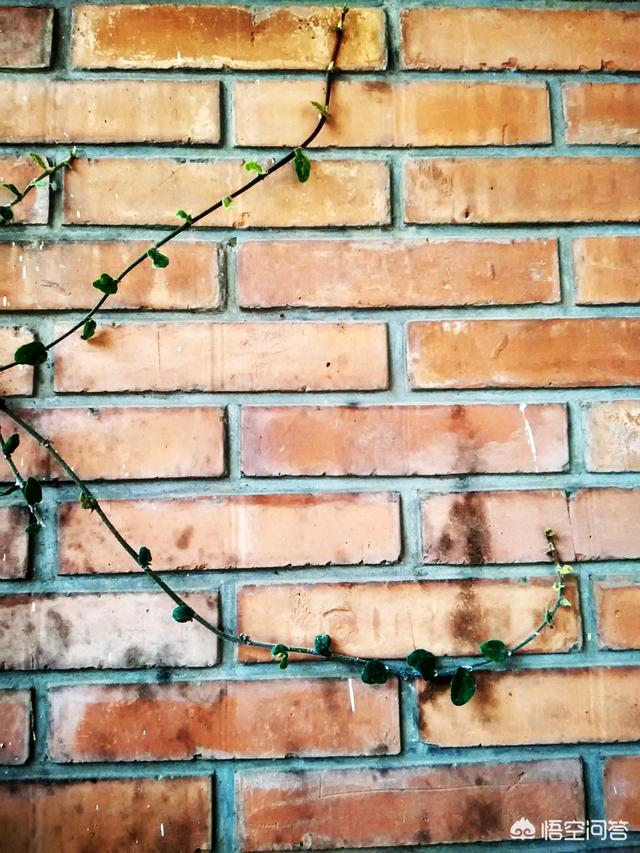 红砖墙上攀爬的藤叶。