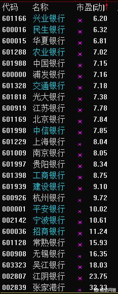 虽然近期四大行很猛,工商银行、建设银行创历史新高了,作为超级大行,但是他们的市盈率依然在10倍以下。我把所有A股上市的银行股的动态市盈率截图给你看:目前低于10倍市盈率的银行股,有17家。