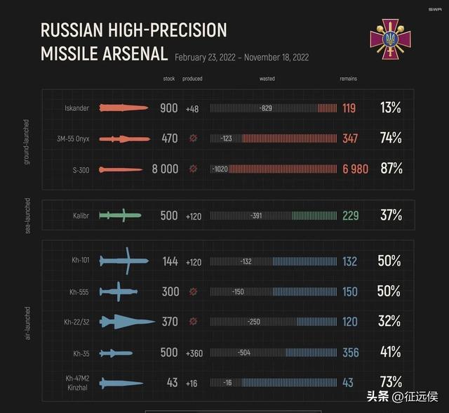 据乌克兰国防部长发布的消息,俄军导弹消耗和库存如下(截止11月18日):